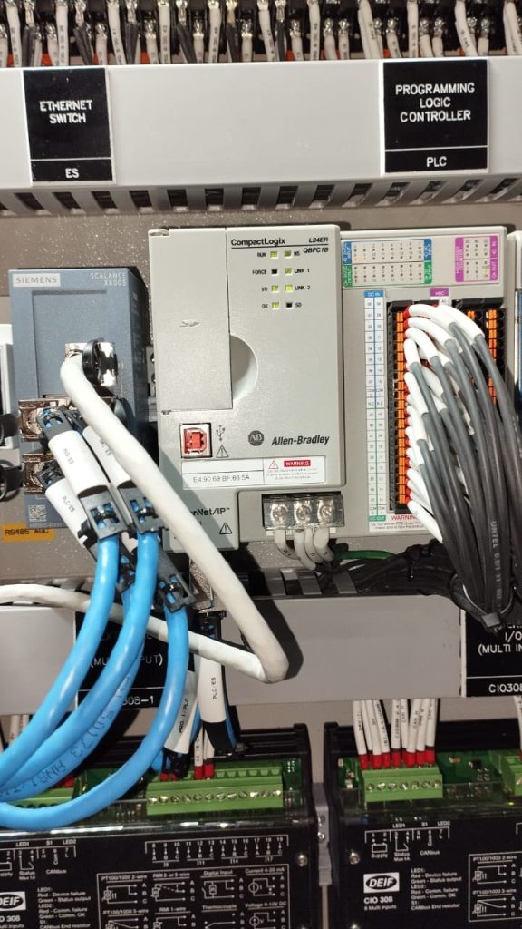 While the DEIF AGC 150 handles core generator functions, additional monitoring and communication requirements demanded another layer of intelligence. This is where the Allen-Bradley Programmable Logic Controller (PLC) was brought into the design.